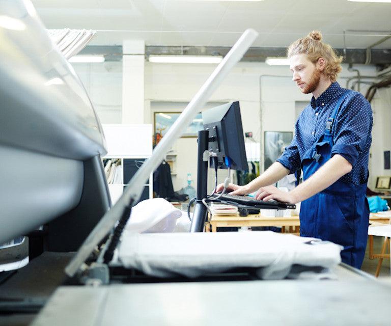 Unsere modernen Digitaldruck-Technologien verbrauchen deutlich weniger Tinte und Wasser als herkömmliche Verfahren wie Siebdruck. Die verwendete Tinte ist SGS-zertifiziert. Vom Zuschnitt über das Nähen und Bügeln bis hin zur Endkontrolle und Verpackung folgt unsere gesamte Produktion den WRAP-Produktionsstandards.